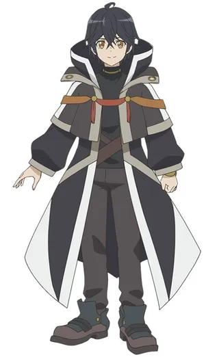 He has Dark Blue Hair and Yellow Eyes. He has the permanent appearance of a 13 year old child. For the majority of the series, he is shown wearing a hooded robe and carrying his staff: Divine Burial Gungnir.