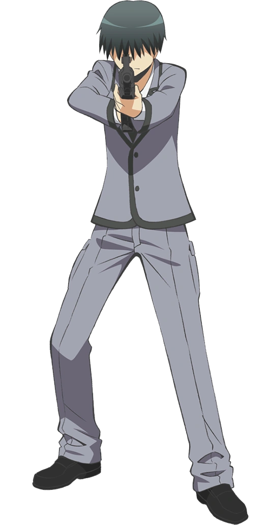 Chiba has black hair with long bangs that cover his eyes. His bangs mark off part of his vision like a gun sight and is the reason for his remarkable skill with firearms. Chiba has an intense gaze that made others uncomfortable, which is the reason for growing out his bangs. In the anime, he has maroon colored eyes.